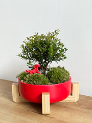 Add a touch of tranquility and vibrant color to your living space with this charming Japanese Holly in a striking red planter. Carefully planted and designed by us! Enhanced with fresh, lush moss that thrives with daily misting and a playful neon pink miniature horse, it brings a unique and lively element to your home decor. Perfect as a thoughtful gift or a refreshing accent for your own space, this delightful plant arrangement invites calm and cheerfulness wherever it’s placed.